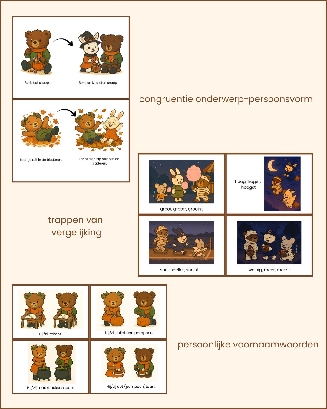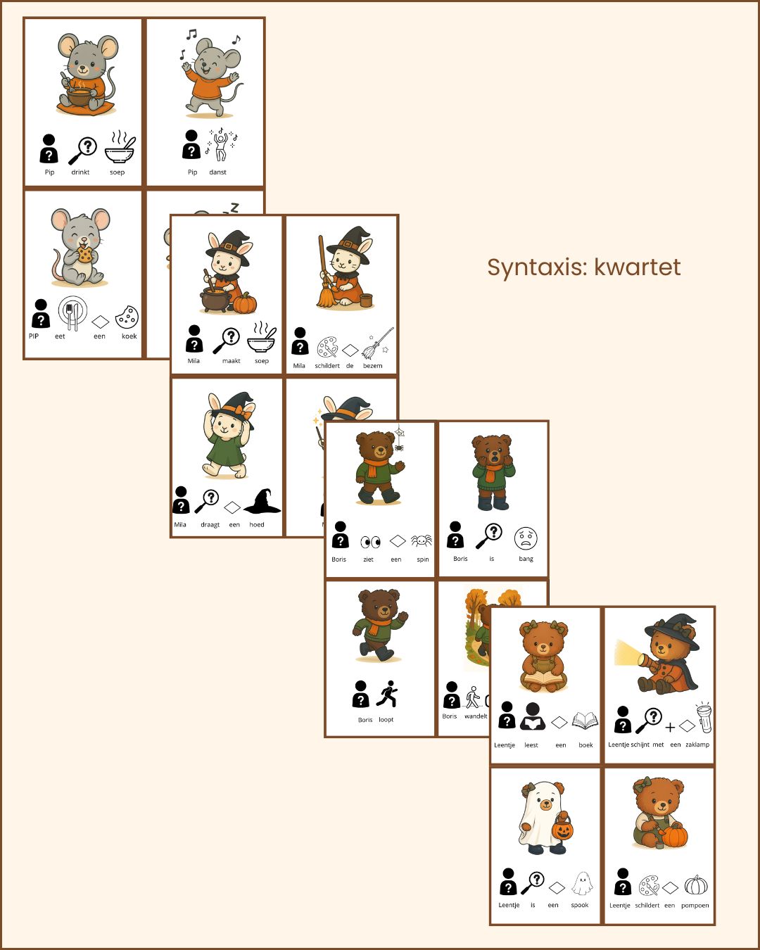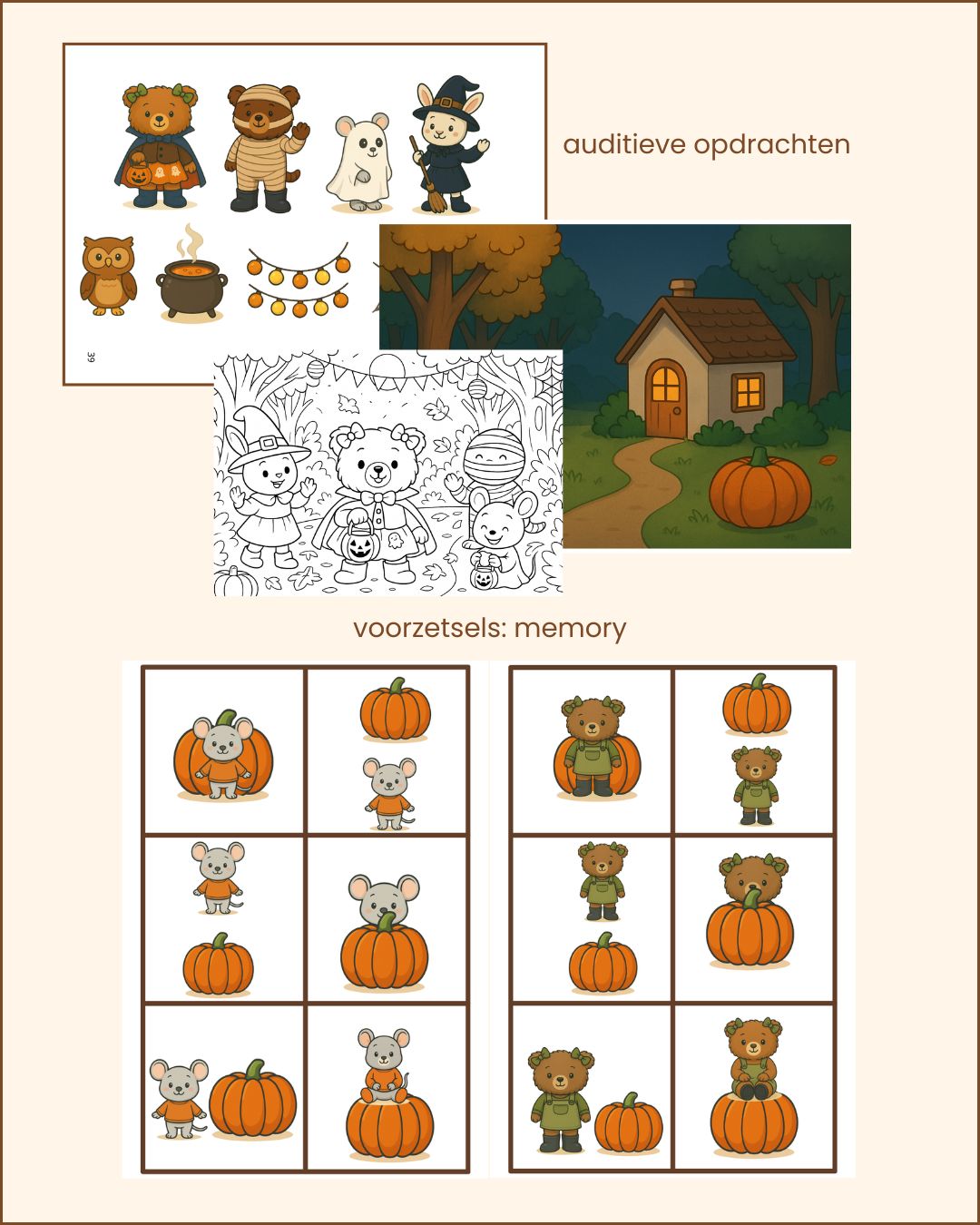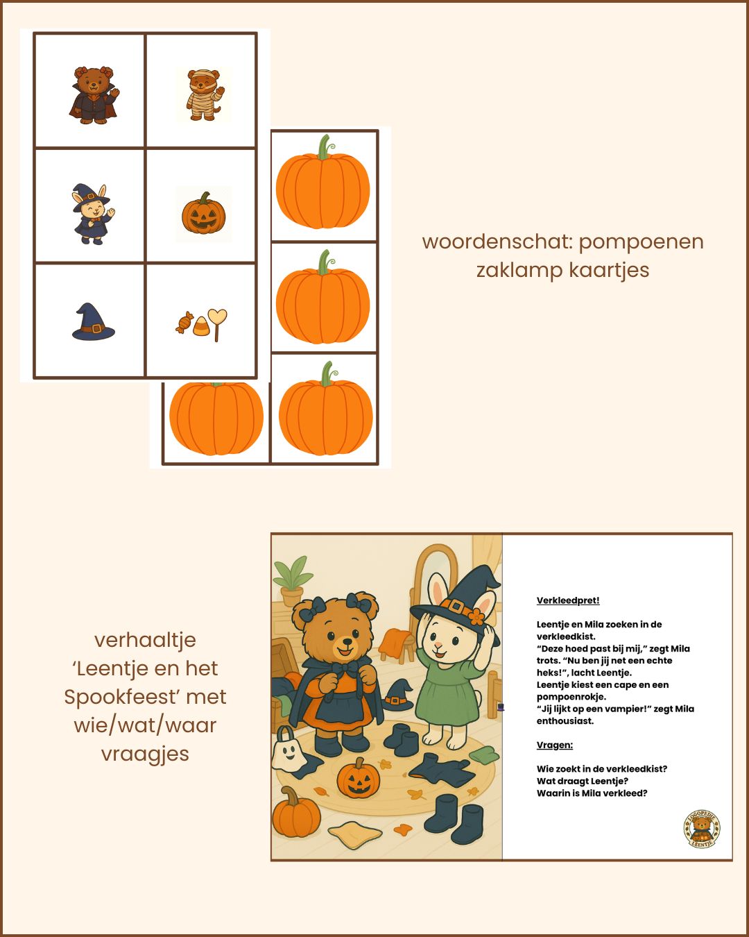 – taalbegrip: wie/wat/waar vragen bij het verhaal ‘Leentje en het Spookfeest’